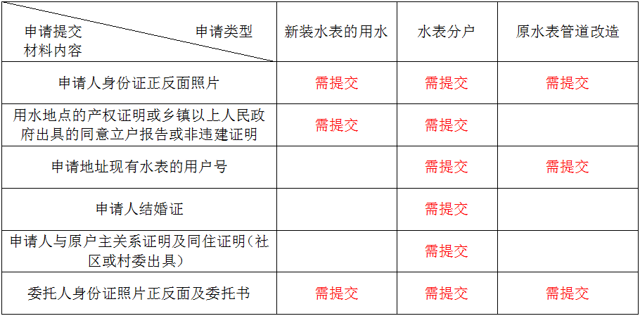 備注:按表格提示要求提交上傳材料,供水單位工作人員現(xiàn)場(chǎng)勘察時(shí),申請(qǐng)人應(yīng)提供與在網(wǎng)上申請(qǐng)?zhí)峤幌嘁恢碌牟牧线M(jìn)行備查。